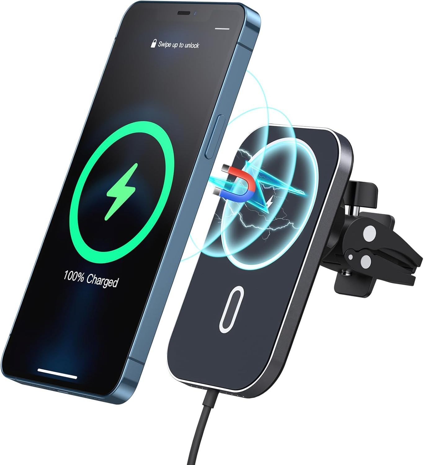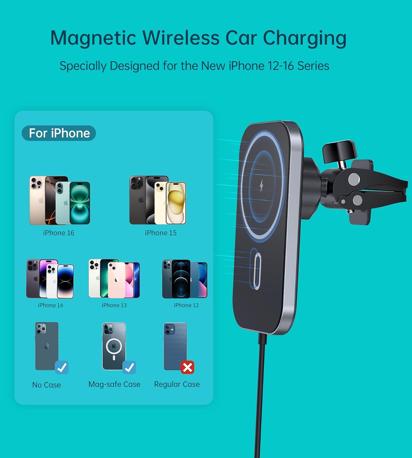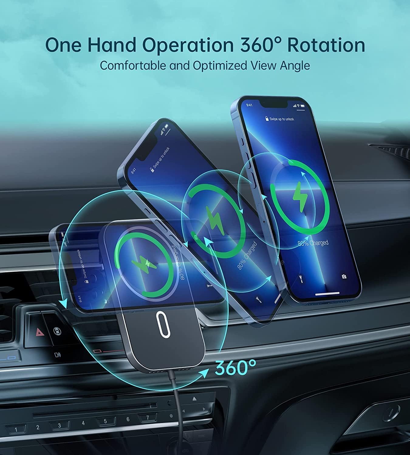 【SNABB MAGNETISK LADDNING】: Detta ventilationsladdningsfäste ger 30 % snabbare laddning på din iPhone 16/15/14/13/12-serien än vanliga trådlösa billaddare, mindre än 3,5 timmar för full laddning från 0 till 100 %